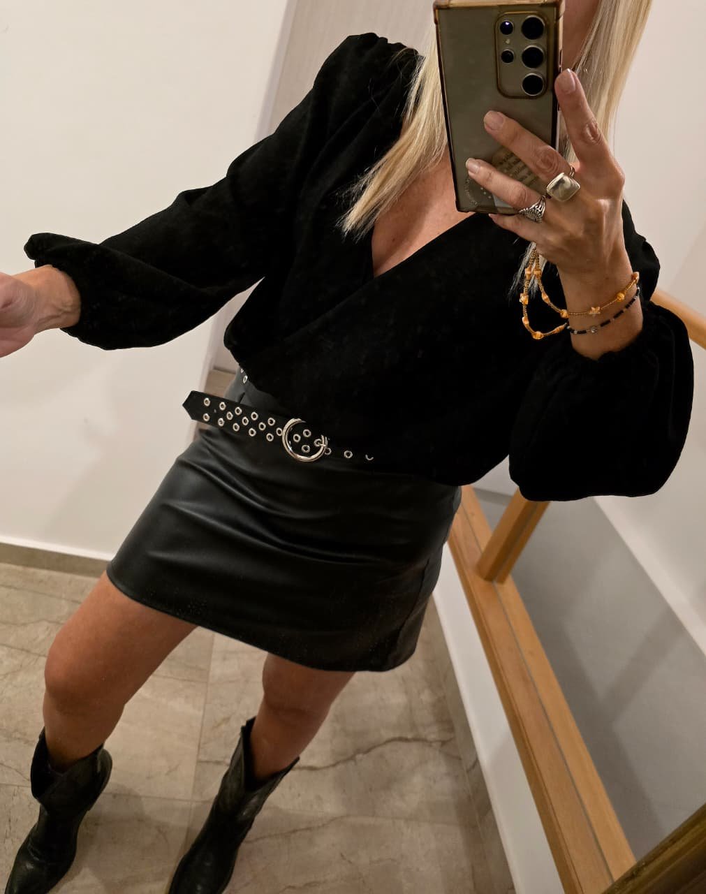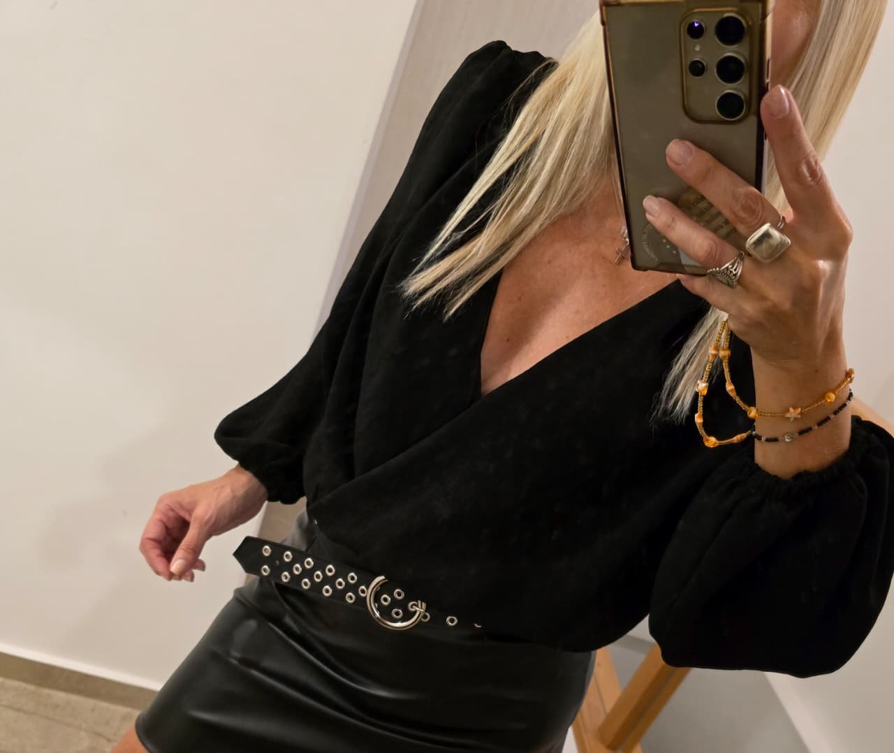 Tela Cey cero plancha , escote cruzado , elástico cintura