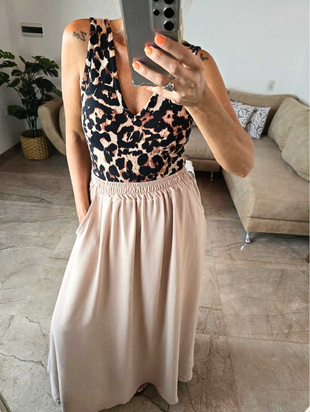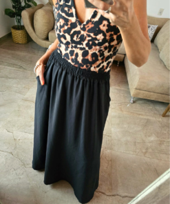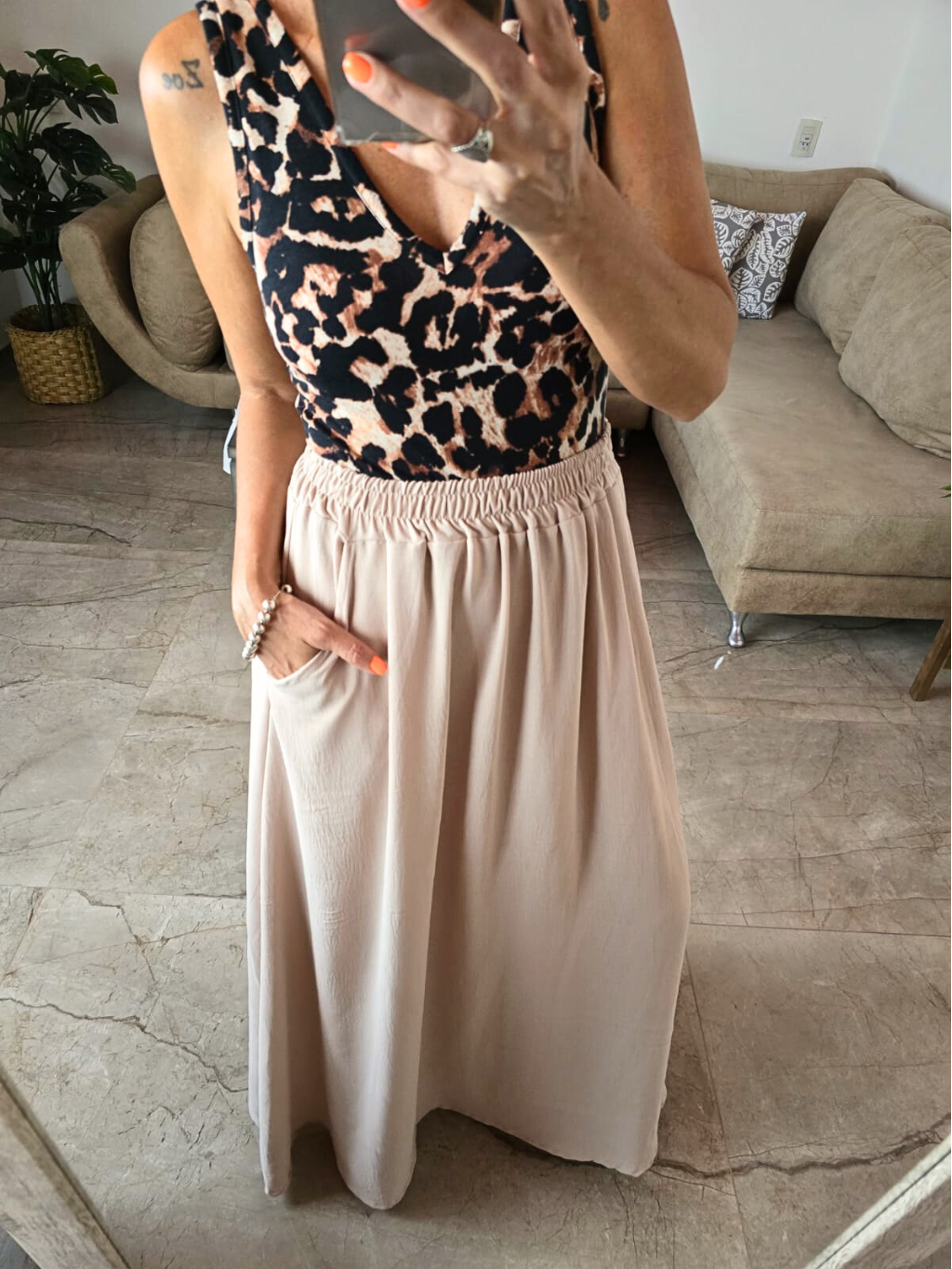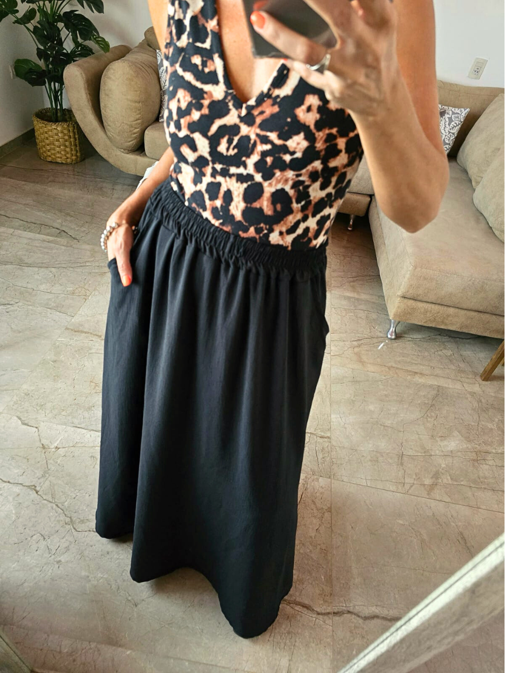 - Falda elástico en cintura con bolsillos, abarca hasta 54 de jeans aprox.